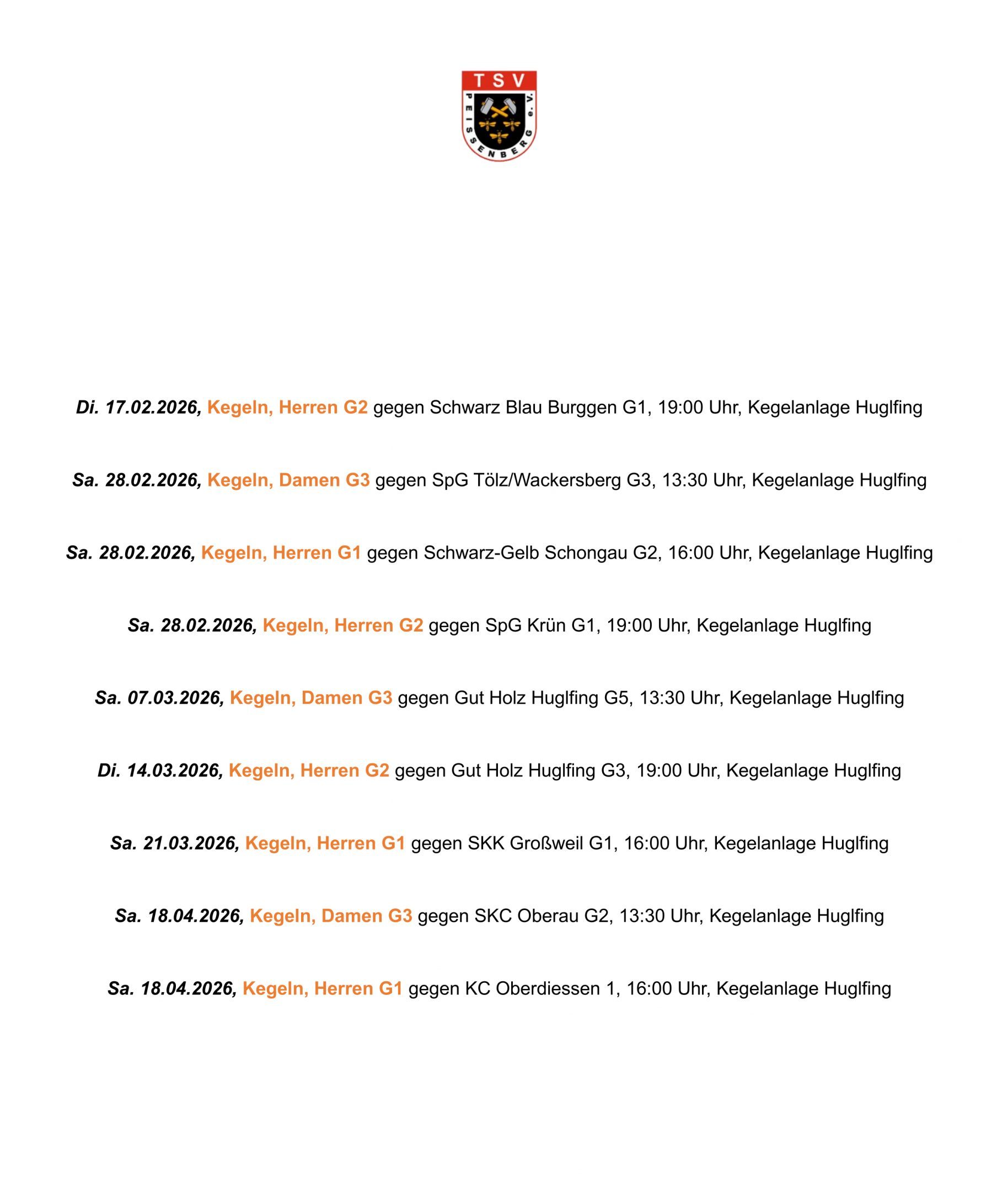 29.11.2025, Ergebnisse des 8. Spieltages Die Ergebnisse des 8. Spieltags: Die erste und zweite Mannschaft gewann. Erste Mannschaft (29.11.2025): TSV Peißenberg G1 : SKC Raisting G1; 6:0 mit 2035 : 1921 Holz Zweite Mannschaft (25.11.2025): TSV Peißenberg G2 : SKC Oberau G1 […]